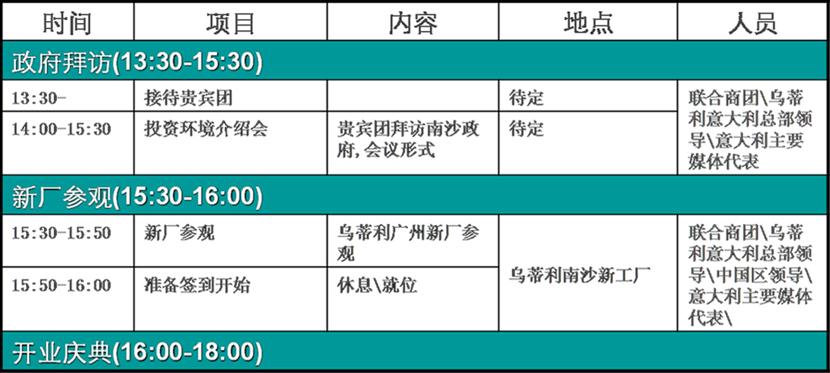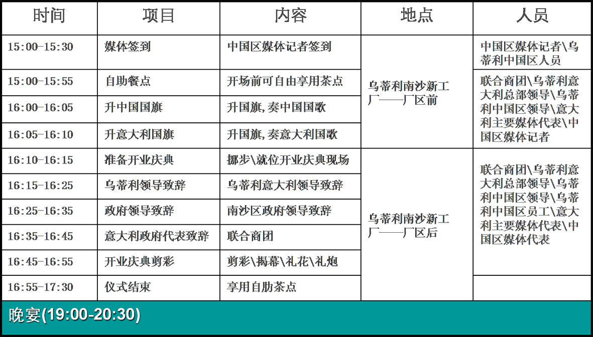 为庆祝新厂房开业,同时迎接乌蒂利意大利领导到中国区的考察,拟于2007年11月29日,在乌蒂利南沙新厂房召开盛大开业庆典。